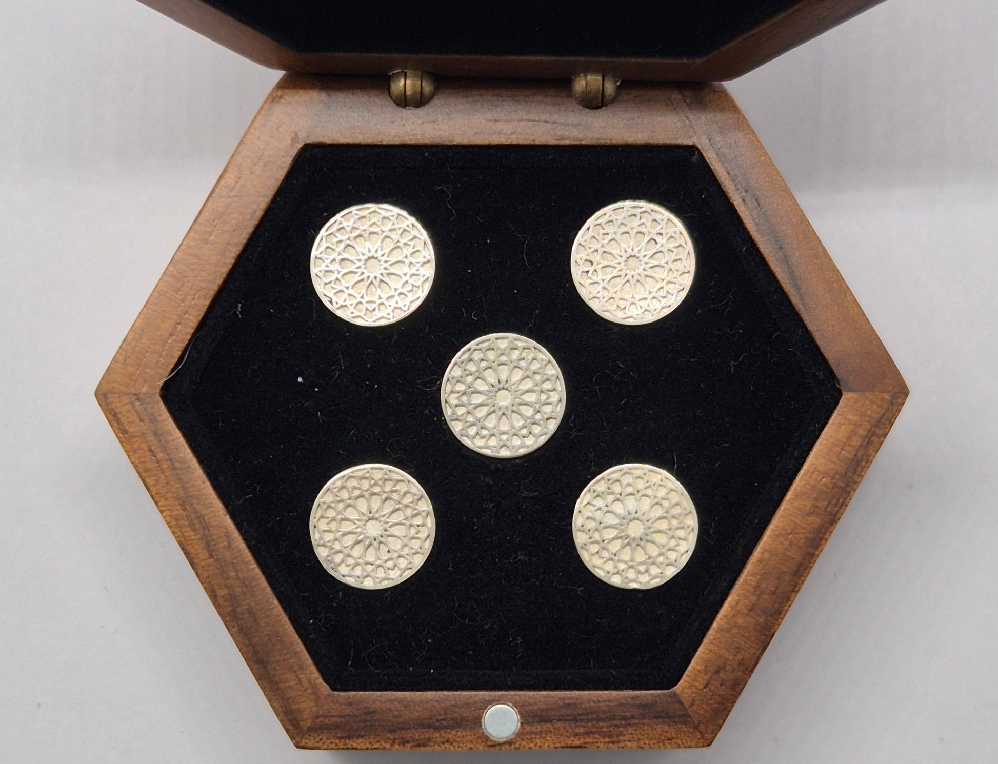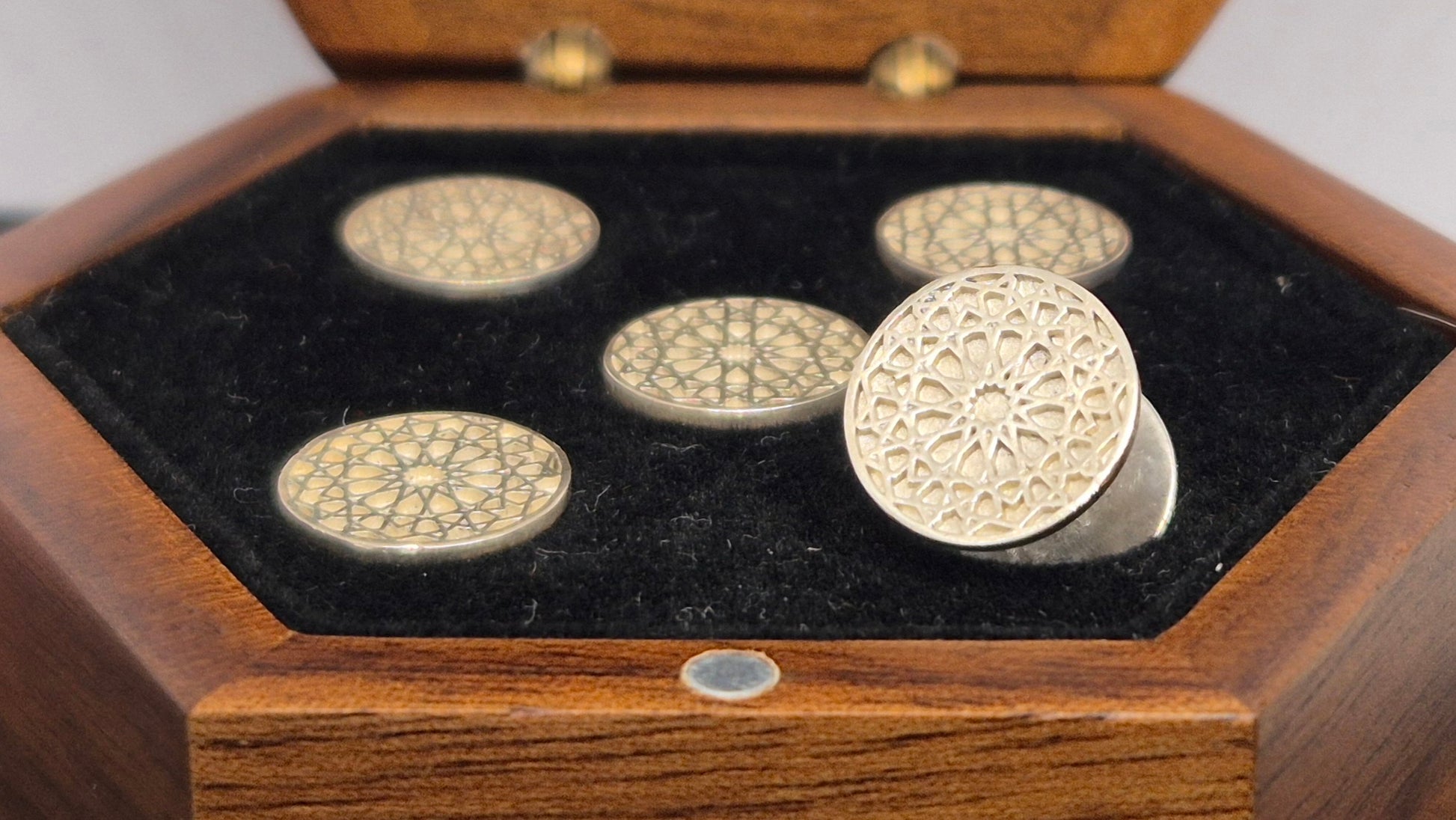 Traditional girih design, a classic in Islamic art. A timeless homage to symmetry and lines. Wear as a set of 5 with your baju melayu or choose a set of 2 to wear as cufflinks