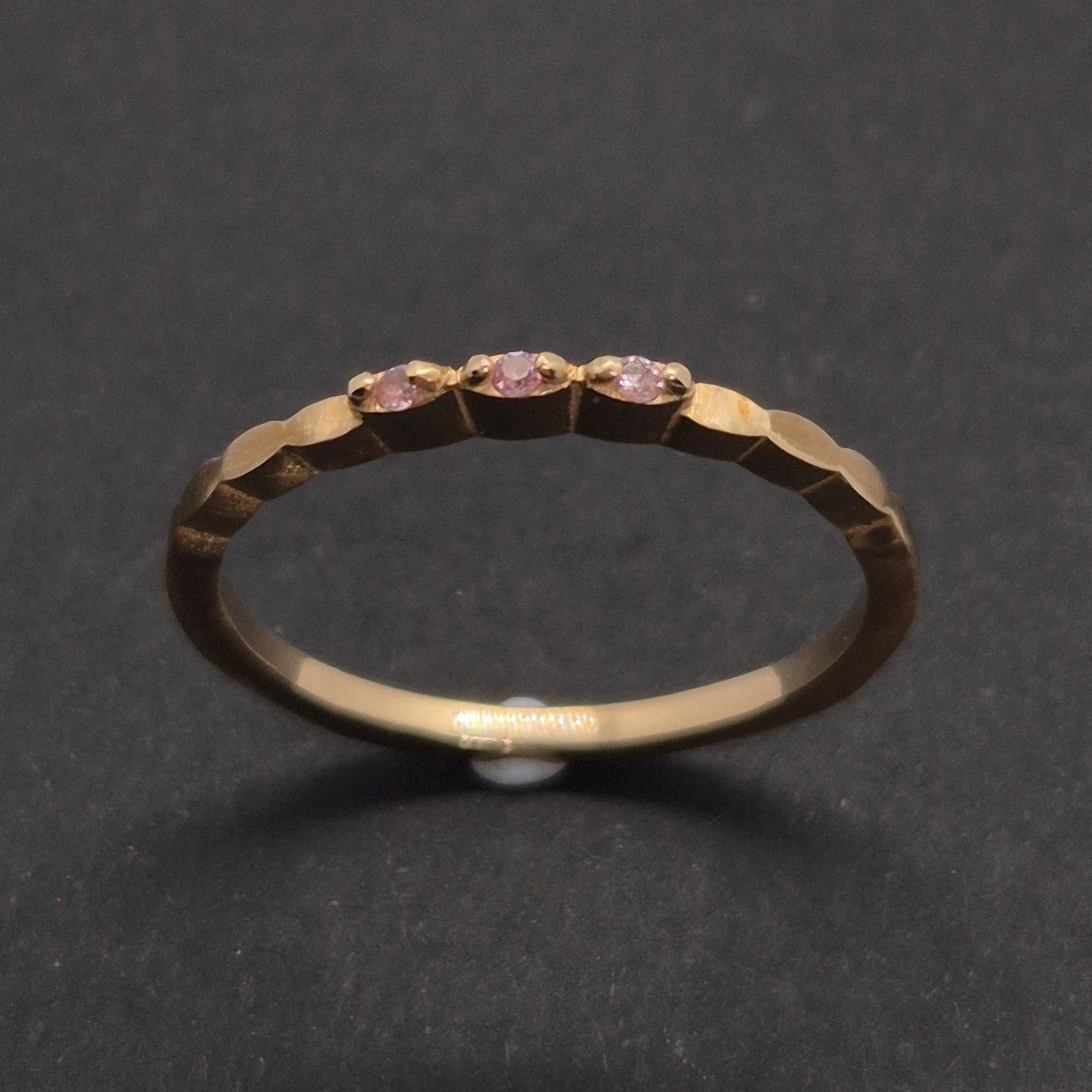 Our three peaks setting paired with natural pink Mozambique sapphires, set in 14k yellow gold